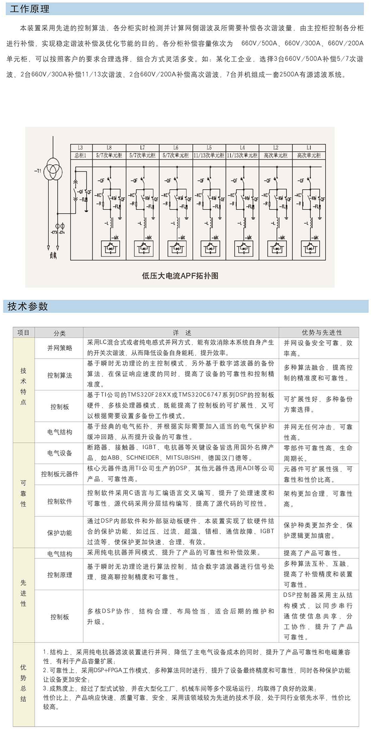PTT專用型低壓大電流APF裝置是基于主從控制模式,將公司研發(fā)的660V/500A、660V/300A、660V/200A單元柜進行組合、優(yōu)化,采用集中控制、分別補償、協(xié)同工作,并機同步等控制手段,研發(fā)出一套適合化工、工礦、冶煉等企業(yè)的低壓大電流純有源電力濾波器,可以對電網(wǎng)諧波負載進行實時檢測和跟蹤補償,單元柜綜合響應(yīng)時間在20ms以內(nèi),整套系統(tǒng)綜合響應(yīng)時間達到50ms,諧波補償后,可致網(wǎng)側(cè)諧波電流畸變率THDI始終保持在5%以內(nèi)。