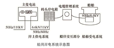 PTTSPS系列船舶靠岸用電系統(tǒng)包括三個(gè)重要組成部分:岸上供電系統(tǒng),船岸交互部分和船舶受電系統(tǒng)。系統(tǒng)示意圖如圖所示: