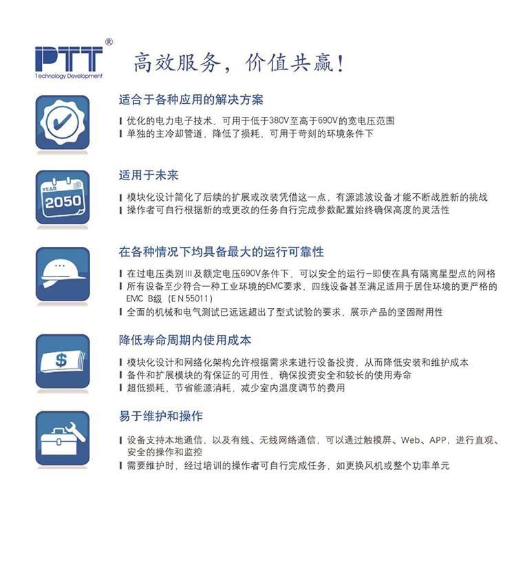 PTT方案分為高效配置方案、標(biāo)準(zhǔn)配置方案、以及為低端客戶專門制作的簡易化方案,總的來說,高效配置方案適合于對節(jié)能敏感的大中型重工企業(yè)用戶,如化工、冶煉、軌道交通、石油化工、汽車制造等;標(biāo)準(zhǔn)配置方案適合于通用客戶,如醫(yī)院、學(xué)校、寫字樓、科研場所以及商場領(lǐng)域;簡易型方案適合于對成本價格較為敏感的制造業(yè)和建筑領(lǐng)域,如低端加工廠、賓館及普通辦公場所,針對每一個領(lǐng)域,都可以極大改善客戶的用電環(huán)境,提升客戶的設(shè)備、儀器使用壽命。